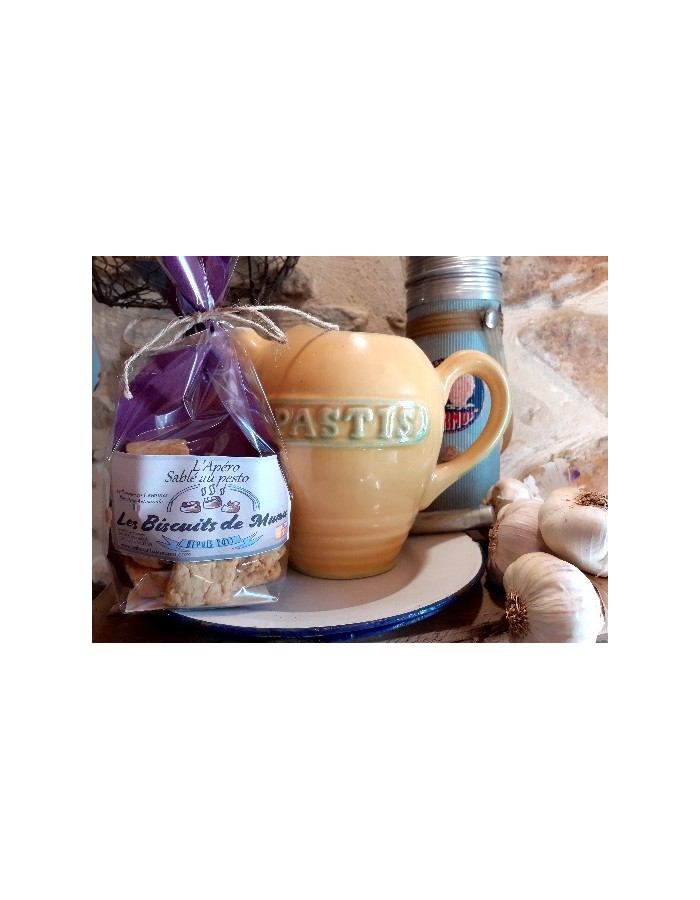 Nous vous proposons l'Apéro au pesto avec de l'ail , du parmesan et du basilic le tout avec le sel de Camargue bio , le sud et le plaisir à chaque bouchée , un sablé fait main , à déguster autour d'un apéritif avec des amis